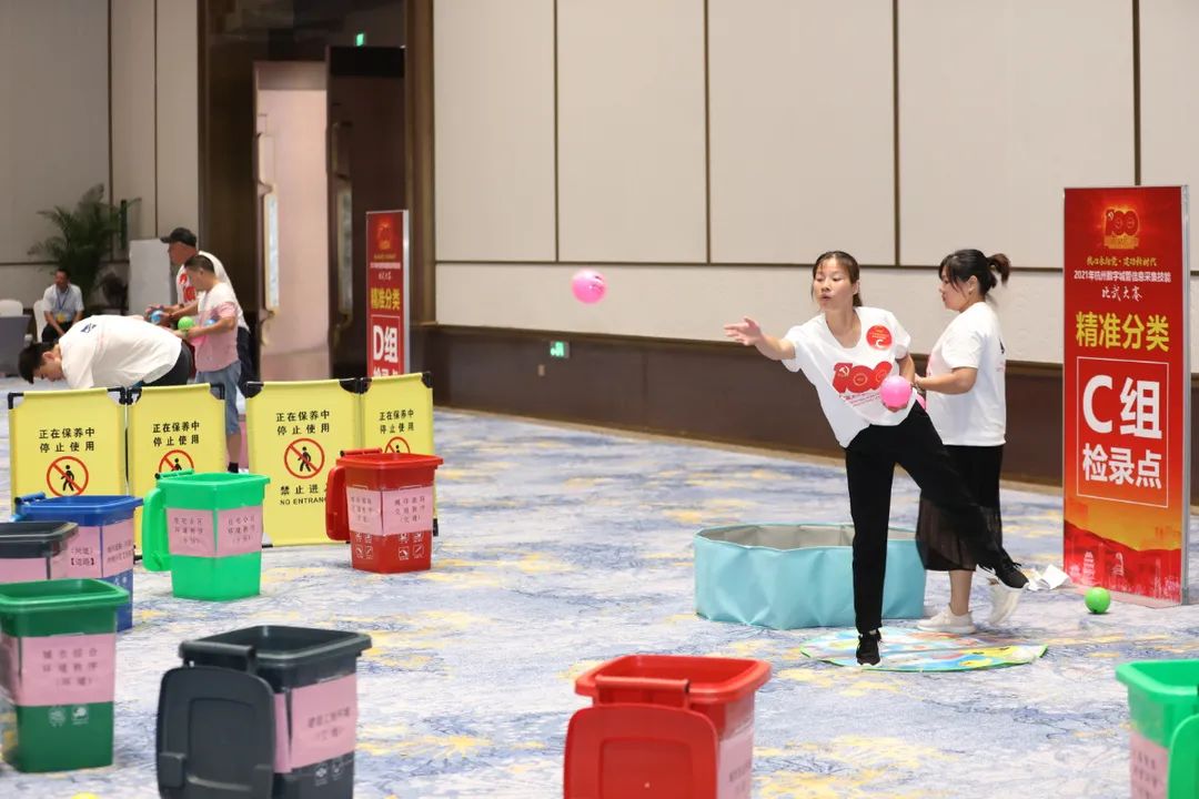 此項(xiàng)比賽是三個(gè)比賽項(xiàng)目中,最富趣味性的。比賽現(xiàn)場(chǎng)放著8個(gè)顏色不同的大類桶,參賽者從寫(xiě)有30個(gè)數(shù)字城管小類的球中選取,將其投入相應(yīng)的垃圾桶中,投中并正確,才能加分,通過(guò)90秒內(nèi)投入桶內(nèi)正確的球數(shù)來(lái)得分,參賽選手們眼疾手快,分秒必爭(zhēng)……