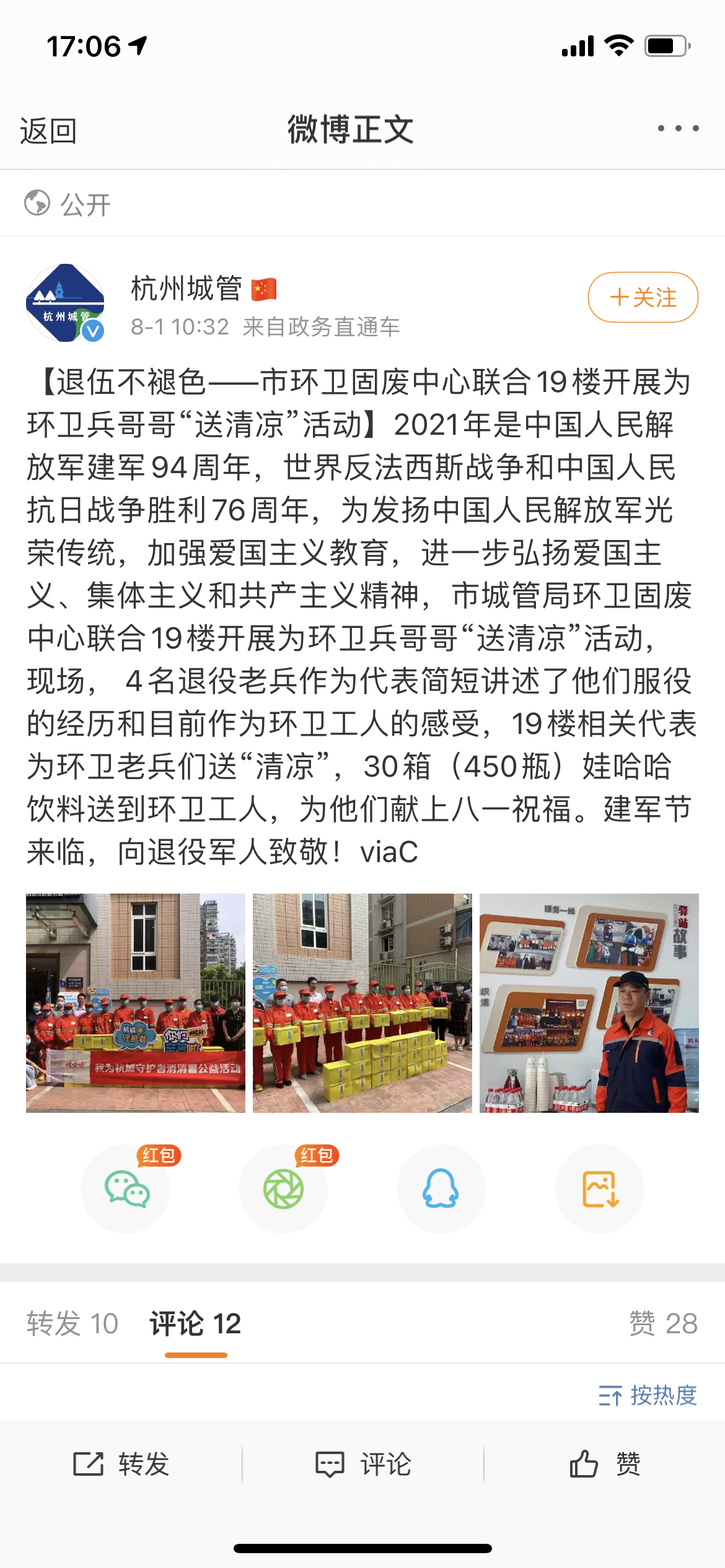 19樓相關(guān)代表為環(huán)衛(wèi)老兵們送“清涼”,30箱(450瓶)娃哈哈飲料送到環(huán)衛(wèi)工人,為他們獻(xiàn)上八一祝福。建軍節(jié)來臨,向退役軍人致敬!