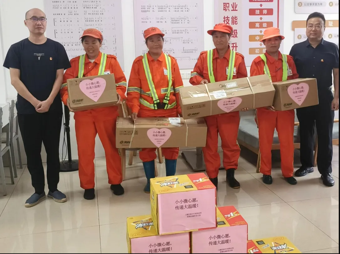 活動(dòng)前期,上城區(qū)綜合行政執(zhí)法局政策法規(guī)科黨支部主動(dòng)了解一線環(huán)衛(wèi)員工的需求,認(rèn)領(lǐng)“微心愿”?;顒?dòng)現(xiàn)場(chǎng),黨員干部們將根據(jù)“微心愿”清單購買的電風(fēng)扇、電飯煲等生活用品親手送到環(huán)衛(wèi)工人們的手上,同時(shí)還為他們送上消暑飲料,切實(shí)解決了他們的生活難題,讓他們切實(shí)感受到了黨組織的關(guān)懷。上城區(qū)綜合行政執(zhí)法局政策法規(guī)科黨支部王國飛書記囑托大家平時(shí)工作要注意安全,保重身體健康,高溫天氣注意防暑。