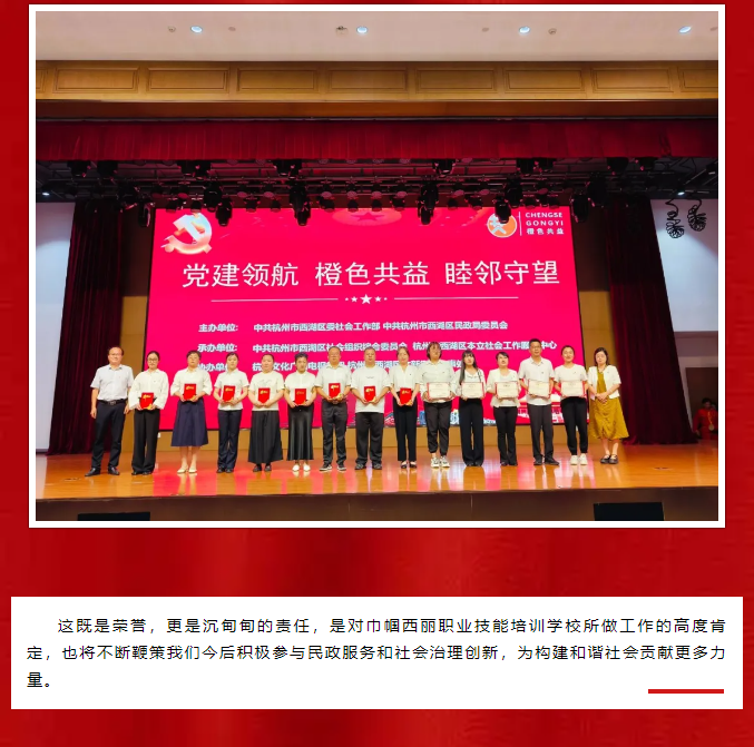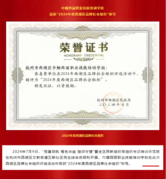 巾幗西麗職業(yè)技能培訓(xùn)學(xué)校榮獲“2024年度西湖區(qū)品牌社會(huì)組織”稱號(hào)